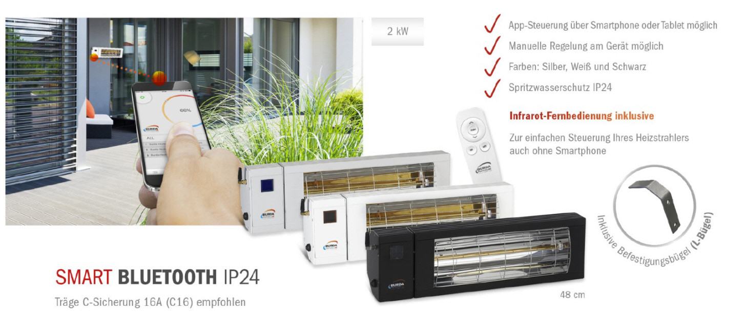 Die nagelneue, Spritzwasser geschützte Burda Bluetooth Infrarotheizung BTBHS2024-1 SMART 2000 Bluetooth Color IP24 mit Low Glare Heizröhre inkl. Fernbedienung, integriertem Schalter und Bluetooth Steuerung per BURDA PERFECTCLIME APP ist Ihr idealer Burda Heizstrahler für Sofortwärme auf Knopdruck! Steuern und dimmen Sie den brandneuen Bluetooth Terrassenstrahler, BTBHS2024-1, ab sofort bequem und sehr einfach, mittels einem am Heizstrahler angebrachten Schalter, mittels der serienmäßig mitgelieferten Infrarot-Fernbedienung oder besonders innovativ mit Ihrem Smartphone und Tablet (Android, IOS) über die spezielle und kostenlos erhältliche BURDA PERFECTCLIME APP.