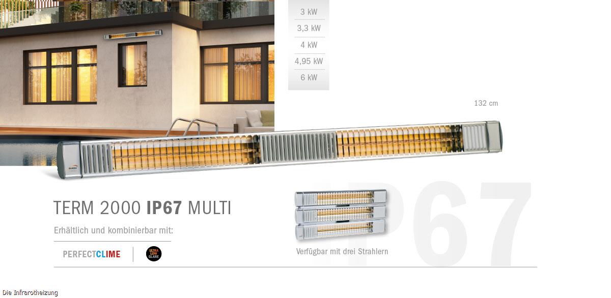 Dreifache Heizkraft mit 4.950 Watt in designstarker Qualität! Der leistungsstarke TERM2000 MULTI IP67 ist ein hochkarätiger Terrassenheizstrahler, der mit einem Wärmebereich von ca. 45qm auch größere Außenflächen erwärmt. Herzstück des absolut wasserdichten Strahlers sind drei ULTRA LOW GLARE Goldröhren mit 80% weniger Rotlichtanteil und einer Betriebslaufzeit bis zu 5.000 Stunden. Das pulverbeschichtete Aluminiumgehäuse ist wasserdicht (IP67) und überdauert problemlos Schnee, Eis und Regen - selbst in ungeschützten Außenbereichen.