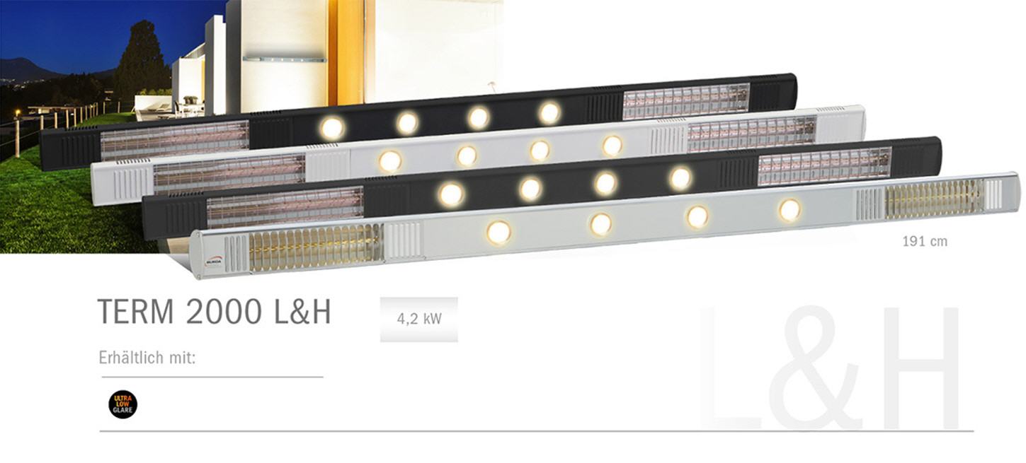 Der patentierte Heizstrahler TERM2000 IP65 L&H ist mit einer Heizröhre (2.000 Watt) und beidseitig mit 180° Grad schwenkbaren LED Spots ausgestattet. Die ULTRA LOW GLARE Heizröhre mit bis zu 80% weniger Rotlicht sorgt für angenehme Sofortwärme in einem Bereich von circa 14-16 qm. Die einzigartige Kombination aus perfekter Temperatur und Licht des Kombistrahlers garantiert die individuelle Wohlfühlatmosphäre. Das patentierte Heating- und Lighting-Konzept bietet nahezu unbegrenzte Einsatzmöglichkeiten in privaten und gewerblich genutzten Außenbereichen.
