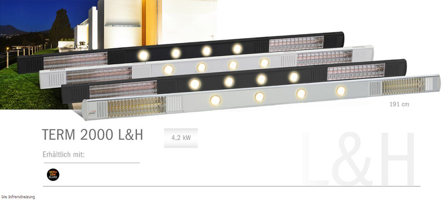 Der TERM2000 IP65 L&H hat eine Gesamtlänge von zwei Metern und ist mit zwei Heizstrahlern (á 2,0 kW) und vier LED-Spots ausgestattet. Das leistungsstarke Multitalent ist ein Garant für Wärme und stimmungsvolle Beleuchtung in größeren, privat oder gewerblich genutzten Außenbereichen. Die einzigartige Kombination aus perfekter Temperatur und Licht garantiert die individuelle Wohlfühlatmosphäre in einem Radius von etwa 28 - 30 qm. Das Gehäuse des Powerstrahlers besteht aus wasserdichtem, robustem Aluminium und ist mit der Schutzklasse IP65 ausgezeichnet.