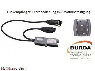 Im Komplett Set ist alles enthalten was Sie für einen Heizstrahler benötigen; der passende Funkempfänger 2 KW, für Ihren Burda Heizstrahler, die passende Hirschmann Stecker-Kupplung und der passende 1 Zonen Handsender (Fernbedienung). Sie müssen an nichts weiter denken. Hier ist alles - zum Super - Preis - enthalten.