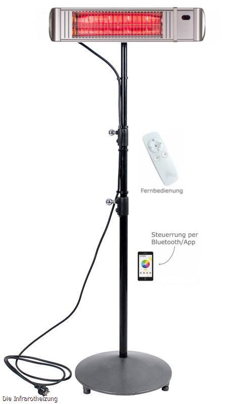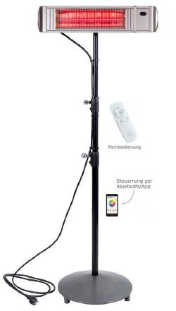 In den Farben Silbergrau und Schwarz, 2 kW, IP65 für ca. 16m2 Erwärmungsfläche auf einem schwarzen Rundfuss-Stativ.