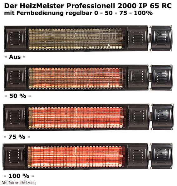 Der Heizmeister 2000 IP 65 RC mit Fernbedienung und Dimmfunktion ist ein Heizstrahler der neuesten Generation ausgestattet mit einer HeLen-Goldröhre.