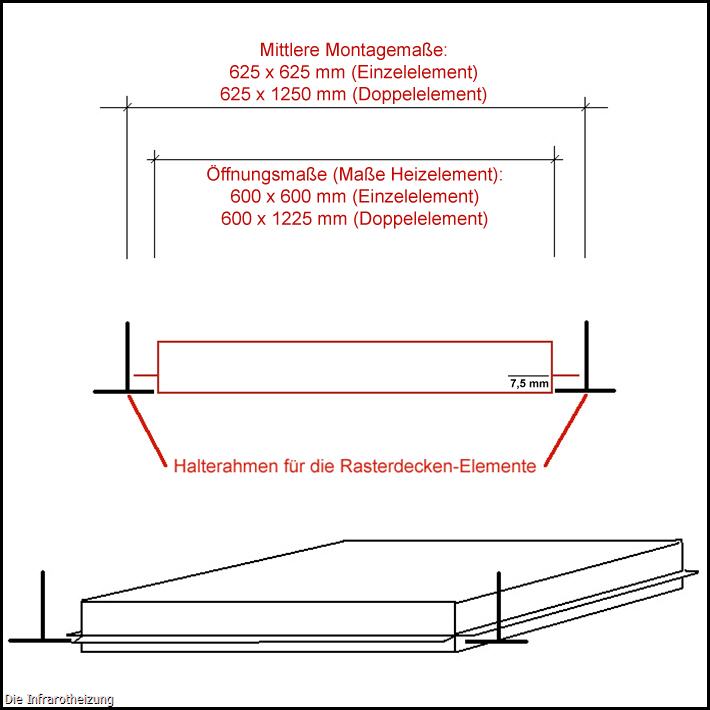 ECOSUN E 300 C 625/Vt - Infrarotheizplatte zur Montage in Kassettendecken (Odenwalddecken, Armstrong Ceiling). Rastermaß 60 x 60 cm. An ihrem Rand befindet sich ein Steg als Auflagefläche in dem Deckenraster.