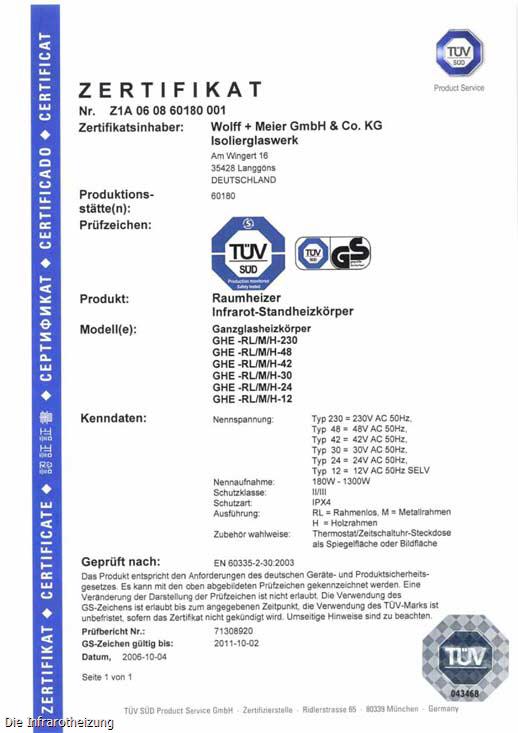 Das Infranomic-Heizelement ist vom TÜV Süd mit dem TÜV/GS-Sicherheitszeichen ausgezeichnet worden. Eine CE-Kennzeichnung bestätigt dem Produkt das Einhalten der geltenden europäischen Richtlinien.