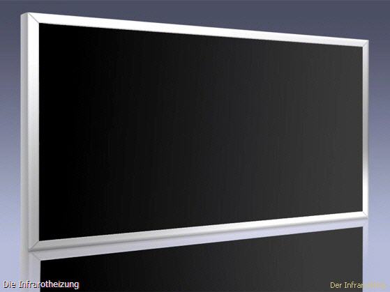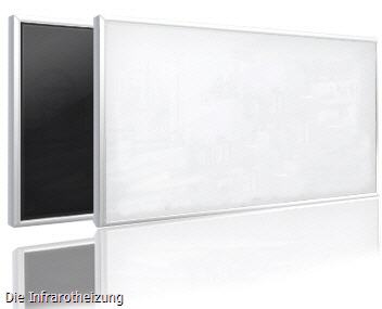 Infrarot Glasheizung mit weißem (RAL 9016 Verkehrsweiß) oder schwarzem (RAL 9017 Verkehrsschwarz) Glas und verschiedenen Rahmen.