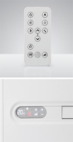 Neben der Fernbedienung ist es auch möglich, alle Funktionen am Gerät direkt einzuschalten, inklusiv einer Lock Funktion, die den unerwünschten Zugriff auf das Klimagerät verhindert. Die Luftausblasrichtung kann ebenfalls über das Touchdisplay des Gerätes gesteuert werden (nach oben oder nach unten).